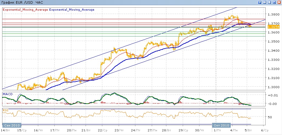 в ходе вчерашнего движения пара снизилась, опустившись ниже уровня 1.3700. сегодняшние торги также показывают снижение пары, при этом пара смогла преодолеть поддержку нижней границы восходящего канала. Средние скользящие ЕМА55 и ЕМА21 продолжают свой рост, но начали замедляться, индикаторы MACD и RSI находятся ниже своих центральных линий. Целями вверх на сегодня станут тестирование 1.3680 (с сопротивлением от ЕМА55), затем 1.3700 и движение к 1.3740 далее. Движение вниз будет проверять на прочность уровень 1.3650, далее тестирование 1.3600 и 1.3580