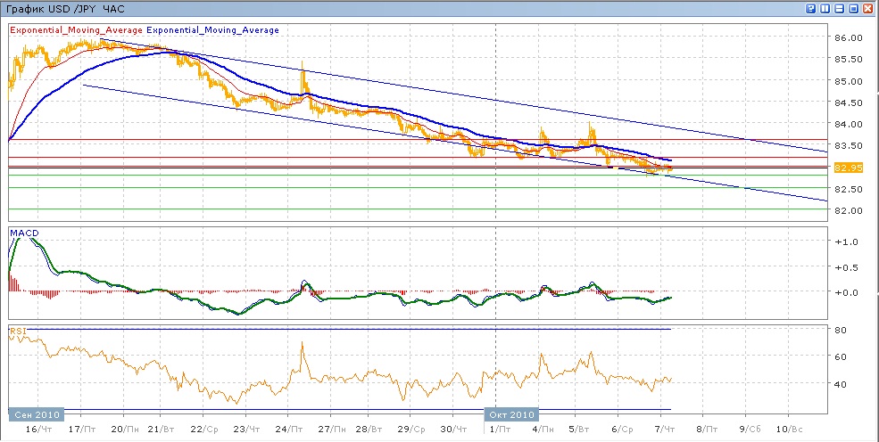 Пара продолжает двигаться в рамках нисходящего тренда. После некоторой стабилизации пара в среду и четверг продолжила свое снижение, показав вчера новый 15-летний минимум на уровне 82,72. При этом снова выйти вниз из канала и зарепиться под ним паре не удалось, нижняя граница канала и поддержка на 82.20 поддержали пару. Сегодняшние торги проходят спокойно, пара торгуется без изменений к открытию. Средние скользящие ЕМА21 и ЕМА55 снова снижаются, индикаторы MACD и RSI со вторника находятся под своими центральными линиями и показывают рост со вчерашнего дня. Цели вверх на сегодня — преодоление отметки 83.00, далее 83.20 (с сопротивлением от ЕМА55) и 83.60. Цели вниз — 82.80, далее 82.50 и 82.00.