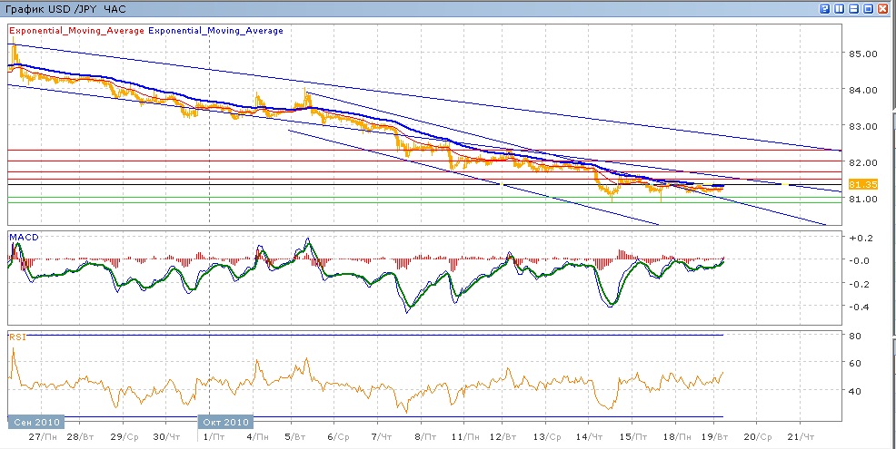 Снижение пары продолжается, пара снижается, испытывая постоянное сопротивление со стороны нисходящей ЕМА55. В пятницу снова была попытка закрепиться под отметкой 81.00 (пара снова достигла 80.87), но не удержалась и ушла вверх.пятница прошла со слабым снижением. В ходе сегодняшних торгов пара торгуется практически без изменений, также пытаясь преодолеть сопротивление ЕМА55. Индикаторы MACD и RSI с прошлого вторника находятся под своими центральными линиями и сейчас пытаются преодолеть вверх свои центральные линии. Цели вверх на сегодня — 81.50 (с сопротивлением от ЕМА55), далее 81.70, 82.00, далее 82.30 и 82.50 Цели вниз — 81.30, далее 81.00 и 80.87.