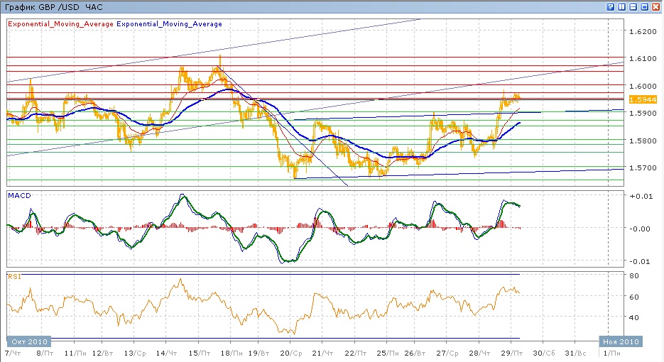в среду, после очередных неудачных попыток преодолеть сопротивление на 1.5870, пара начала снижатсья, добравшись до 1.5750. после этого пара начала расти, пройдя в четверг порядка 150 пунктов, в ходе чего были преодолены уровень 1.5900 и верхняя граница восходящего канала. Продвинуться выше не позволило сопротивление на 1.5950, которое также сдерживает прау и в ходе сегодняшней торговли. Средние скользящие ЕМА21 и ЕМА55 пересеклись вверх, индикаторы MACD и RSI находятся над своими центральными линиями и немного снижаются. Цели на сегодня вверх — преодоление верхней границы канала 1.5950, далее 1.5970, тестирование 1.6000 и продвижение к 1.6050. Движение вниз будет направлено на 1.5900, затем 1.5870, 1.5850 (с поддержкой от ЕМА55), далее проверка на прочность уровня 1.5800.