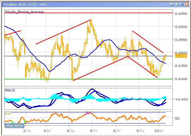 Текущий, достаточно активный рост находится под угрозой распродаж, на высоких уровнях, вблизи отметки 0.6400, которая является уровнем сопротивления. Пара, в очередной раз протестировав поддержку 0.6300, в результате чего цена отскочила, что мы и наблюдали в начале сегодняшнего торгового дня. В среднесрочной перспективе пара находится под давлением, поэтому текущий рост было бы целесообразно использовать как возможность более выгодно войти в рынок, при этом сигнал к входу следует искать на более мелких графиках с помощью технических средств. На часовом графике технические индикаторы указывают на возможный рост, однако учитывая то, что тенденция краткосрочная и развивается она менее суток, данные сигналы будут запаздывающими.
