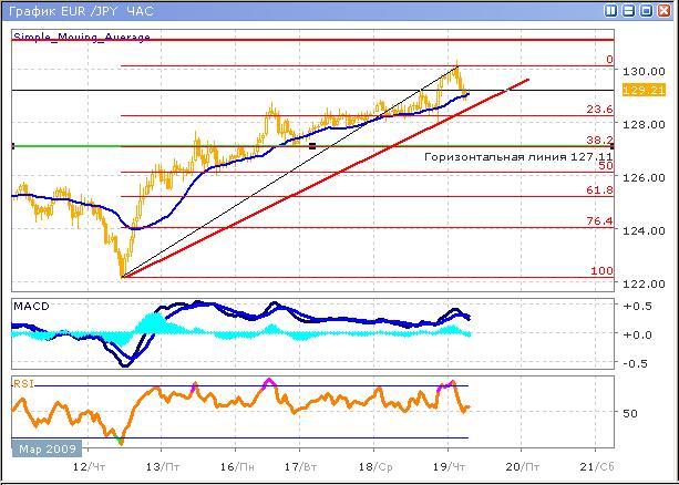 Падение доллара против основных валют на фоне количественного смягчения валютной политики ФРС, вызвало некий сумбур в динамике кросс-курсов. Резкое укрепление курса японской валюты оказалось медленнее чем падение доллара против евро, поэтому данная пара устремилась вверх. Наиболее вероятно, что в дальнейшем курсы евро и йены против доллара придут в состояние равновесия, что в начале потребует от пары снижения. В целом рост ограничен уровнем сопротивления 131.10, а в краткосрочной перспективе ожидается коррекция. Технические индикаторы сигнализируют о снижении пары, осциллятор MACD подает двойной сигнал к продаже, пересечением гистограммой нулевой оси, и пересечением скользящих средних. RSI демонстрирует снижение к средней линии, которая, однако, еще не пробита. Целью коррекции является отметка 127.10, уровень коррекции Фибоначчи 38.2%.