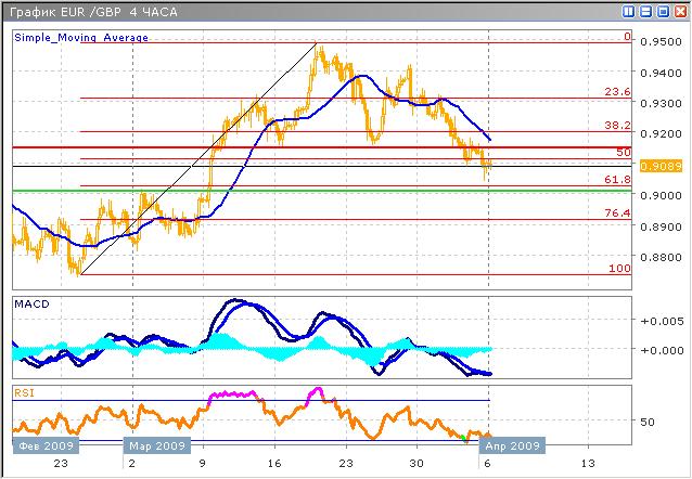 В настоящий момент на 4-часовом графике мы можем наблюдать завершенную пятиволновку Элиота. Первая импульсная волна началась в конце февраля, вся восходящая структура, завершилась 19 марта, и в данный момент мы находимся в конце вольны (с). Таким образом, в среднесрочной перспективе ожидаем начала следующей восходящей волны более высокого порядка к отметке 0.9800. Гистограмма MACD расположена приближается к нулевой оси, демонстрируя при этом постоянство, скользящие средние индикатора подают сигнал на покупку, пересекаясь соответствующим образом. График индикатора RSI демонстрирует, снижение, что может насторожить покупателей, поэтому рекомендуется дождаться положительных сигналов от обоих индикаторов, после чего и вступать в растущий тренд.