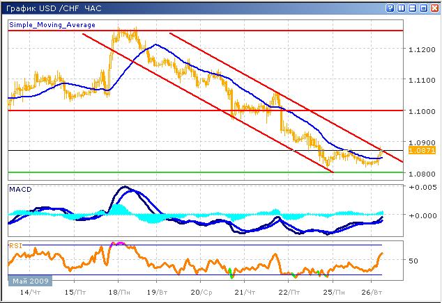 Замедление падения цен по паре было ожидаемо участниками торгов. В среднесрочной перспективе ожидается продолжение торгов в нисходящем канале, который виден на часовом графике, уровень 1.0800, будет взят в скором будущем. Участники торгов воздерживаются от активных действий, поскольку до сих пор не совсем ясен настрой американских инвесторов после длительного уик-энда. По этой причине торги протекают в узком боковом канале вблизи заявленной поддержки. В любом случае, долгосрочная тенденция является нисходящей, поэтому этом открытие длинных позиций связано с большими рисками, нежели продажи, однако, все же лучше дождаться более глубокой восходящей коррекции, вероятность которой сохраняется. График индикатора RSI стремительно растет, приближаясь к области перекупленности. Гистограмма MACD несколько сбросила темпы роста, все еще находясь в положительной зоне.
