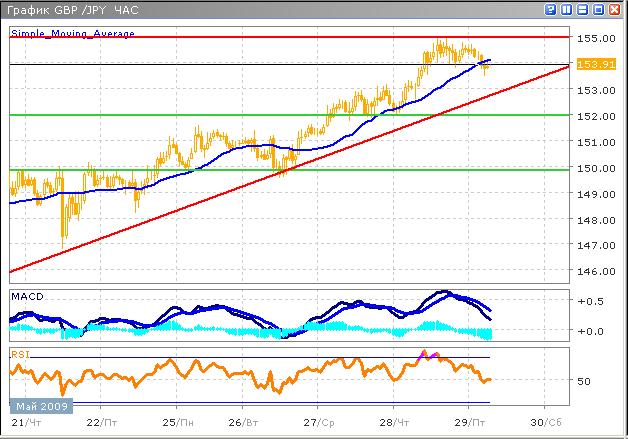 Развивающаяся в данный момент коррекция, едва ли изменит бычьи настроения в ближайшее время, поскольку в среднесрочном плане паре оказана поддержка технических и фундаментальных факторов, что достаточно красноречиво видно на часовом графике. В краткосрочном же планировании, наиболее вероятен рост, после непродолжительной коррекции, поскольку пара находится вблизи сильного сопротивления 155.00 Цель кратковременного снижения расположена у отметки 153.00, которая является ближайшей локальной поддержкой. В обозримом будущем ожидается очередное тестирование уровня 155.00, однако неделя закончится ниже этой отметки. В настоящий момент технические индикаторы указывают на возможное развитие коррекции, вследствие активности продавцов, привлеченных высокими ценами, моментум нисходящего тренда растет, что иллюстрирует гистограмма MACD, в то время как, график индикатора RSI пересекает среднюю линию в нисходящем направлении.