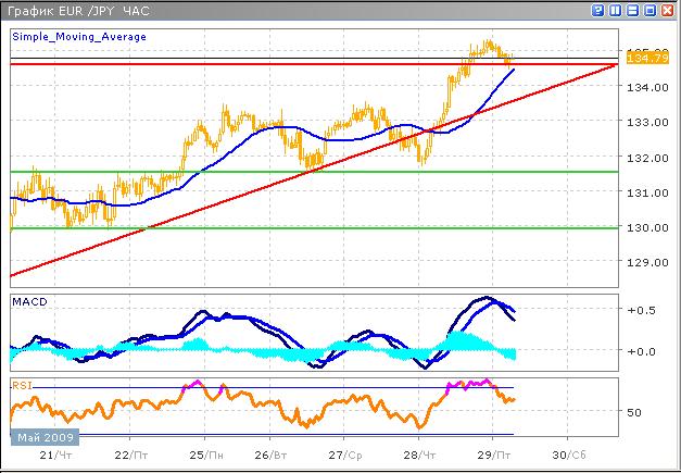 Покупатели пробили уровень сопротивления 135.00 и устремилась вверх. Данный уровень тестировался дважды, что видно на часовом графике, и представляет собой достаточно важный психологический уровень. В настоящий момент мы наблюдаем коррекцию восходящего тренда, которая похоже уже отработана. Технические индикаторы указывают ослабление темпов снижения. Гистограмма осциллятора MACD близка к формированию локального минимума, что соответствует снижению движущей силы нисходящего тренда, в то время как скользящие средние все еще снижаются, расширяя между собой расстояние, что является сигналом к продолжению падения, на более крупных графиках, но уже с меньшей активностью. График индикатора RSI расположившись в верхней половине окна, разворачивается, предварительно снизившись.