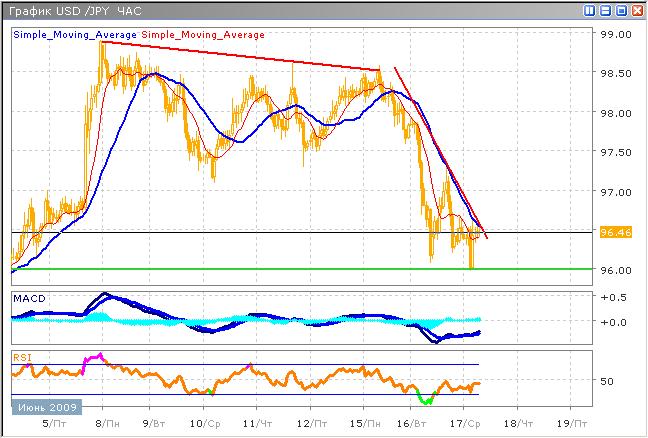 В долгосрочном планировании ожидается рост пары, поскольку фундаментальный перевес остается за долларом США. В настоящий момент японская иена несколько укрепилась против доллара США, что повышает потенциал предстоящего роста, при этом бычий сценарий по паре наиболее вероятен так же и в среднесрочной перспективе. На часовом графике можно наблюдать систему сложных коррекционных движений, которые в общем подчиняются законам волнового подсчета коррекций. В настоящий момент цена находится у уровня поддержки 96.00, который в краткосрочном плане может задержать снижение. Судя по сигналам индикаторов, в течение сегодняшнего дня, ожидается снижение пары. Технические индикаторы указывают на предстоящее снижение перед продолжением развития возрастающего тренда. График индикатора RSI постепенно разворачивается, после выхода из области перепроданности, в то время как гистограмма осциллятора MACD падает к нулевой оси, ранее развиваясь в активной зоне.
