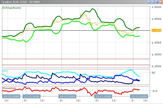 С самого утра тренд ослабляется, после того как на выходных произошёл скачок евро против доллара. Пара колеблется вблизи уровня 1.3973, внутридневные максимум и минимум на данный момент соответственно: 1.4043 и 1.3949. Учитывая то, что индикатор среднего направленного движения снижается ниже отметки 40, трудно делать какие-то прогнозы на грядущий день. Падение цен в краткосрочном периоде имеет несколько более серьёзную направленность, нежели рост, однако, обе тенденции слабы и изменчивы. Возможно, пара будет продолжать боковое движение внутри коридора, ограниченного уровнями сопротивления 1.4050 и поддержки - 1.3955. Скорость падения цен порядка +0.015.