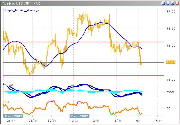 Динамику торгов на валютном рынке в настоящее время определяют фондовые рынки, поскольку они первыми отреагируют на начало восстановительных тенденций в крупнейших экономиках мира. В настоящий момент азиатские рынки падают на фоне пессимизма инвесторов. В связи с этим, в краткосрочном периоде ожидается продолжение снижения пары с целью 95.10. В среднесрочной перспективе достаточно велика вероятность роста пары к уровню 96.00. Гистограмма MACD стремительно падает, отражая рост моментума нисходящего тренда. Аналогичный сигнал подает и индикатор RSI, который, пребывает в данный момент в области перепроданности. Настоящий момент не является выгодным для входа в рынок, поскольку тренд уже прошел большую свою часть, и в скором будущем развернется. В долгосрочной перспективе ожидается рост пары, поэтому занятие длинных позиций более приоритетно.