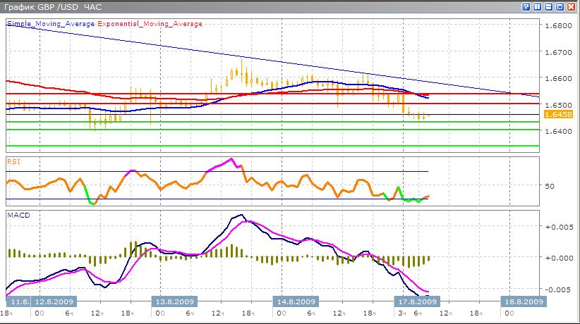 На часовом графике продолжает доминировать начавшееся 5 августа нисходящее движение, которое всю прошлую неделю пыталось преодолеть поддержку на уровне 1.6400-1,6430. Начало сегодняшних торгов открылось также движением вниз, но указанный диапазон продолжает оказывать поддержку паре. Индикаторы RSI и MACD показывают главенство нисходящего движения — RSI только вышел чуть выше уровня перепроданности, MACD, несмотря на рост гистограммы, также находится ниже своей центральной линии. Покупка пары в этих условиях должна быть краткосрочной и очень осторожной. Движение вниз получит поддержку на уровне 1.6400-1,6430, при успешном преодолении которого пара может нацелиться на 1.6339 (минимум от 30 июля). Цель движения вверх — тестирование 1.6500, далее движение вверх может встретить сопротивление на уровне 1.6535, где также проходят и средние скользящие ЕМА21 и ЕМА55.