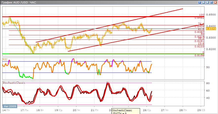 Австралийский доллар по-прежнему находится в возрастающем канале, все возможности указывают на то, что его рост будет продолжаться до линии сопротивления на отметке в 0.8482. Его блокировка в этом канале указывает на то, что в целом экономические новости выходящие по экономике Австралии не имеют на рынке резких реакций в какую-либо сторону, и в она сейчас серьезно выправляется после глубокого спада. Другие методы анализа указывают на то, что этот тренд восходящий продолжится, и возможно, не изменит направление в ближайшие несколько дней. Stohastic пересеклись две линии быстра и медленная и направлены вверх, что подтверждает текущий тред, об этом же нам говорит и RSI, выйдя из зоны перекупленности.